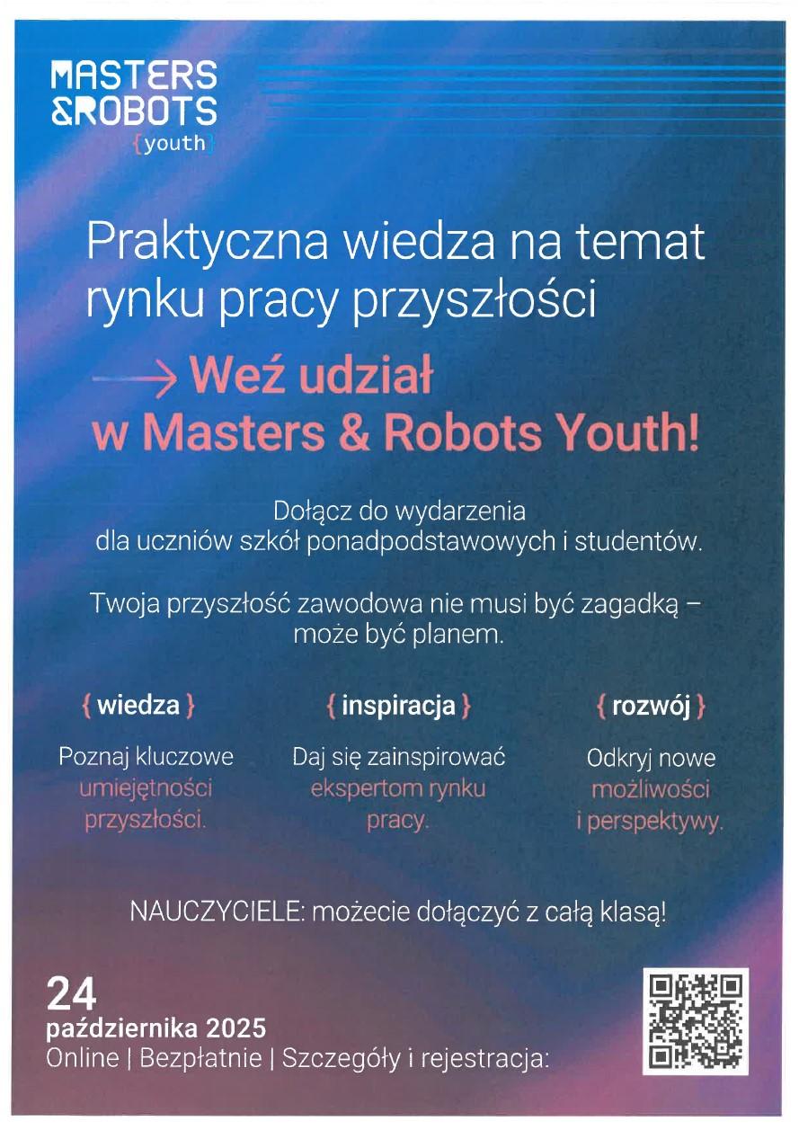 Zachęcamy nauczycieli szkół ponadpodstawowych do udziału wraz z uczniami w bezpłatnej konferencji Masters & Robots Youth organizowanej przez Fundację Digital University, która odbędzie się 24 października 2025 roku, w godzinach 10.00-13.00, online (30-dniowy dostęp do nagrania dla zarejestrowanych użytkowników).