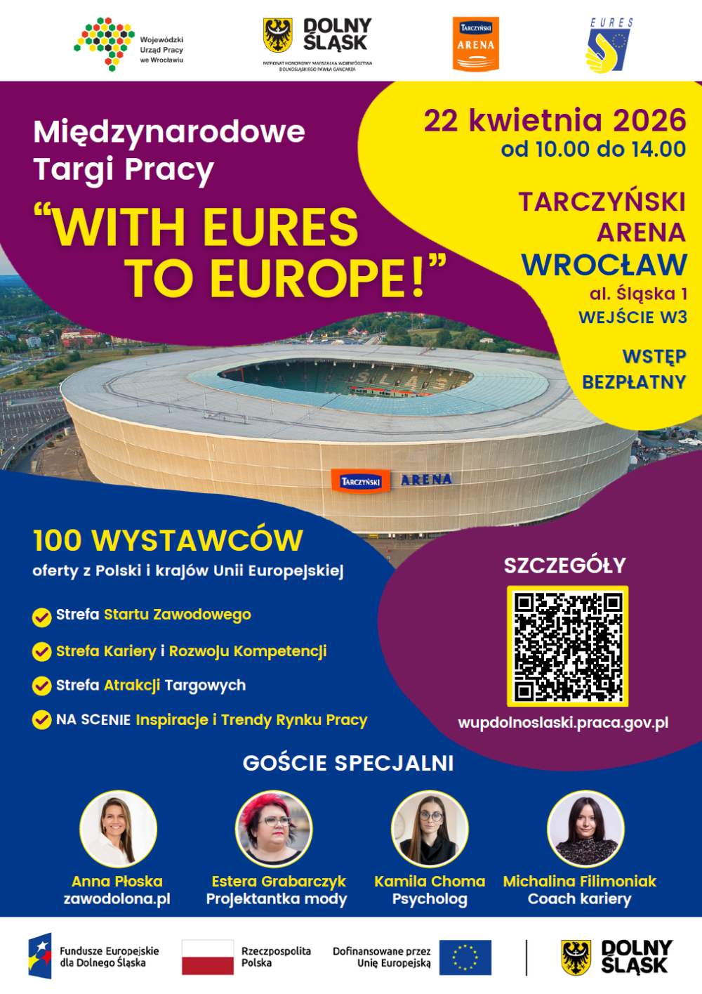 Międzynarodowe Targi Pracy „With EURES to Europe!”, które odbędą się na Tarczyński Arena Wrocław, 22 kwiecień 2026 r. w godz. 10:00 -14:00.